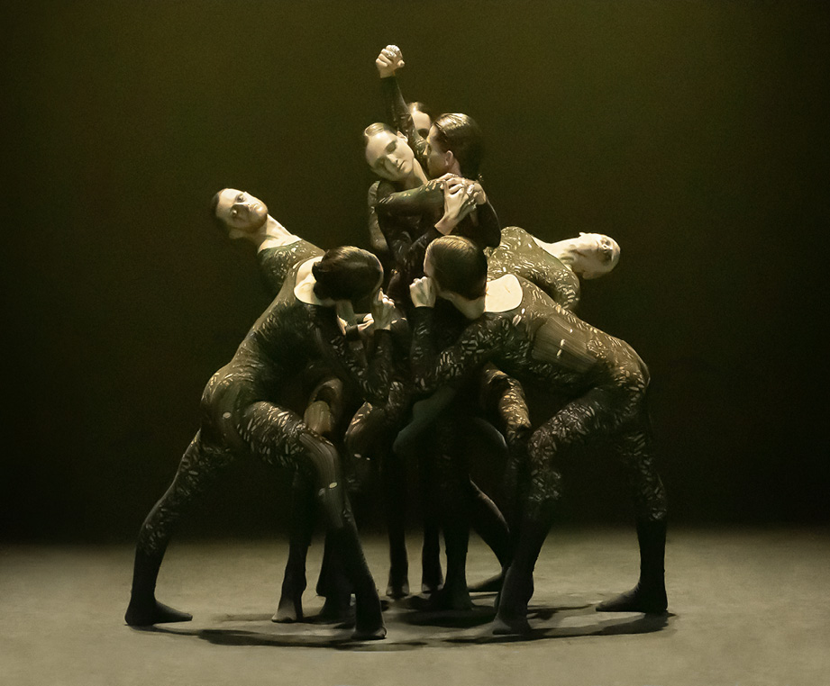 Zu der hypnotischen elektronischen Musik des englischen Komponisten Koreless alias Lewis Roberts, in die sich sakrale Töne einfügen, erwacht eine Gruppe von Menschen zum Leben. Nur die blassen Gesichter und Hände sind beleuchtet. Das gespenstische Licht entfacht eine seltsame Zeremonie, die Sharon Eyal folgendermaßen beschreibt: „Ich liebe Schwarz. Für mich ist Schwarz Licht, und die Tänzer bringen das Licht.“ In diesem permanenten Halbdunkel von unterschiedlicher Intensität ruft die Bewegung eine schlafwandlerische Menschlichkeit hervor. Die spinnenartigen, hautengen Kostüme sind so dünn wie eine zweite Haut – eine bis in die Fingerspitzen raffinierte Ästhetik. „Into the Hairy“ erscheint wie ein Gemälde, das sich ständig neu zusammensetzt und wieder auflöst, mit eigenwilligen Körperhaltungen, zu grotesken Figuren verzerrten Silhouetten oder allegorischen Tableaus, die an ein Altarbild erinnern: ausgestreckte Arme, geneigte oder entblößte Oberkörper. Mit diesem Meisterwerk will Sharon Eyal eine cineastische Erfahrung hervorrufen, ohne einem konkreten narrativen Faden zu folgen.
