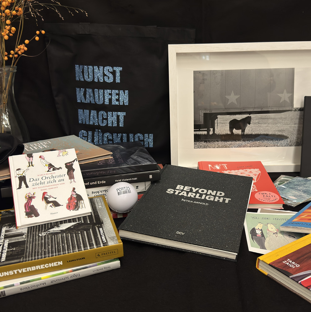 Auf fast 500 Quadratmetern Fläche werden im „PORT25 – Raum für Gegenwartskunst“ in Einzel- und Gruppenausstellungen regionale und überregionale Künstlerinnen und Künstler ausgestellt. Der Eintritt ist immer frei. Was aber manch einer vielleicht nicht weiß: Auch wer schöne Geschenke sucht, wird hier sicherlich fündig, denn der Bookshop bietet eine große Auswahl an Büchern zu Kunst und Kultur, außerdem ausgewählte Kinder- und Jugendbücher (Fotografie, Kataloge regionaler oder internationaler Kunstschaffender). Außerdem werden Postkarten und Siebdrucke der Siebdruckwerkstatt Antighost (benachbarte Werkstatt in der Werftstraße im Jungbusch) verkauft, genauso wie luxuriös bedruckte Taschen, Notizbücher, Anti-Stressbälle und mehr. Nach den Preisen der Kunstwerke kann man im PORT25 immer offen fragen – oft ist ein Kunstwerk günstiger als vielleicht befürchtet. Unter dem Motto „Kunst für jeden Geldbeutel“ bieten sich Editionen von zum Beispiel Petra Arnold „The Red Pony“ (Fine Art Print auf Photo Rag, 30 x 40 cm) an oder weitere Editionen von Arthur Bauer, Marita Damkröger, Andrea Eßwein oder Myriam Holme.